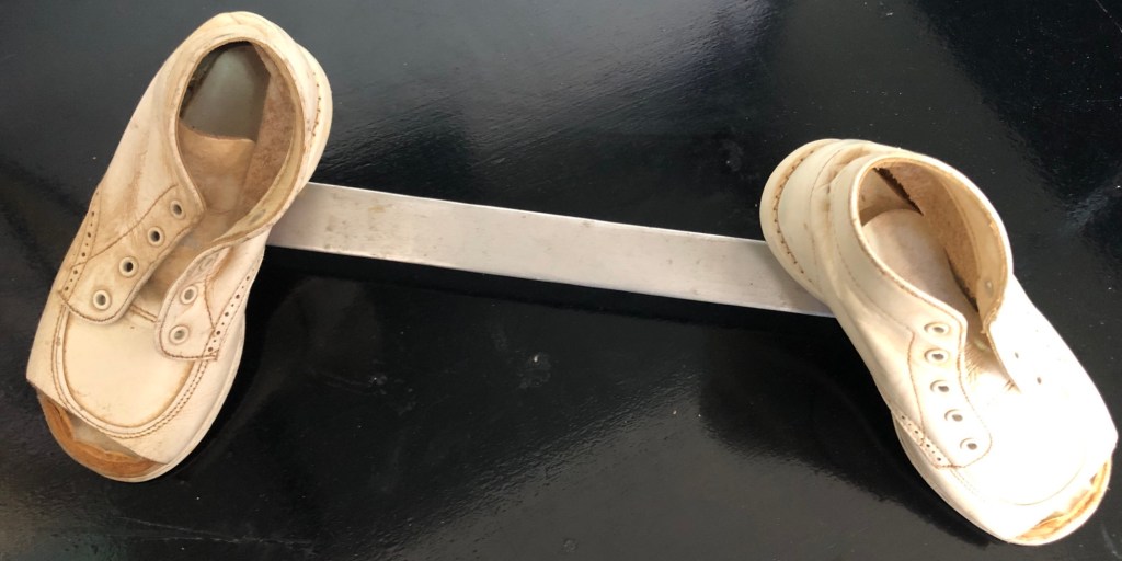 Underneath Dad’s back brace was my own brace. This one featured two tiny shoes mounted onto a silver metal bar. The shoes are called Baby Beaver Walkers according to the logo on their bottom sole. I just adore that name! The contraption, not so much. The bar the shoes are mounted to features two knobs that loosen and tighten to turn the shoes to an angle from -80 to +90 degrees. Some of my earliest memories are of awakening, sliding out of the bed with my feet shackled together, then going to my knees to crawl up the hall to my parents’ bedroom to have the corrective shoes removed. I’m not sure how old I was when I started sleeping in this device that was intended to correct my pigeon-toed left foot, which I, apparently, inherited from my dad. Prior to Polio, young Carl was also pigeon-toed. After lying flat on his back for months, he progressed to sitting up in bed, standing beside the bed, then learning to walk all over again. His physical therapist was determined to correct his gait, so she made him walk between two rows of bricks so that his feet had to align as he walked. Maybe my own doctor should have adopted that approach. Though I wore the corrective shoes every night long enough that the toes had to be cut out to accommodate my growing feet, still, at almost fifty-nine, I am pigeon-toed. My left shoe tends to scuff the toe of my right shoe, especially when I am tired. The brace brings up early feelings of craving freedom, independence. I like to imagine myself in the scene from Forrest Gump, the brace falling away as I took off at a full run.