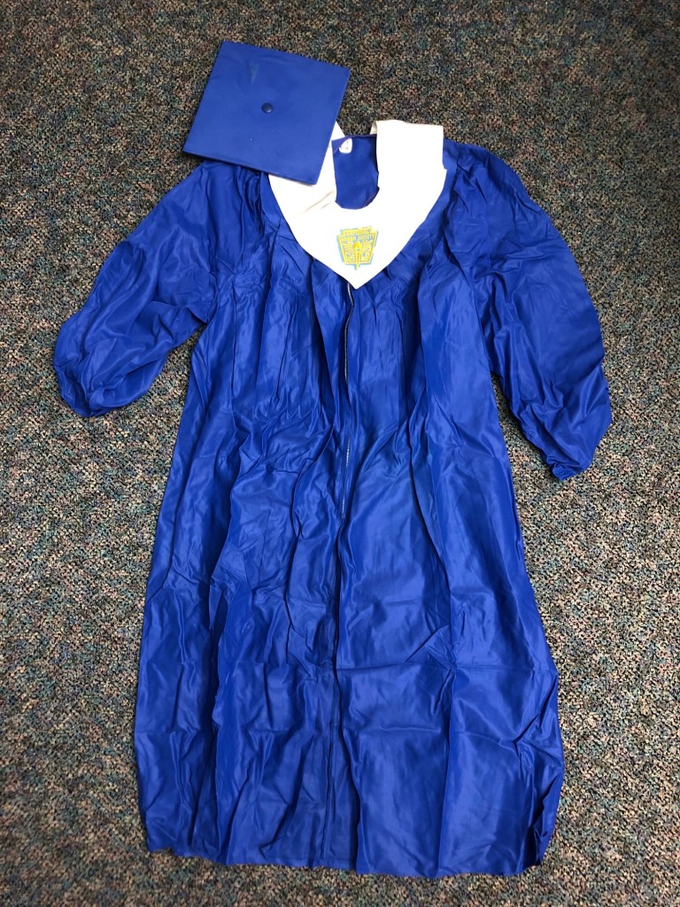 The last treasure in the box of memorabilia was my cap and gown from my graduation at North Mecklenburg High School. My gold and blue tassels were missing (last seen hanging from my car’s rear view mirror during Senior Week at Myrtle Beach), but my Honor Society collar sash was there, looking like it did when I graduated in 1983. There had been nothing stored in the box from my junior high years. No surprise there. I wanted to forget those. The cap and gown, the sash, brought back a million memories from some of the best years of my life. I, regretfully, sold my high school class ring when gold prices were high, figuring I’d never worn it once I got the college ring. Still, I wished immediately that I had kept it for the nostalgia. The cap and gown were a good substitute. Memories of Putt Putt and Eastland Mall, football games and Godfather’s Pizza afterwards, and dates with my future husband, Darryl, at Darryl’s Restaurant and in the courting room at my childhood home flooded in as I held the robe in my hands for the first time in 40 years. It’s sad none of those places exist as they were anymore other than in memory.