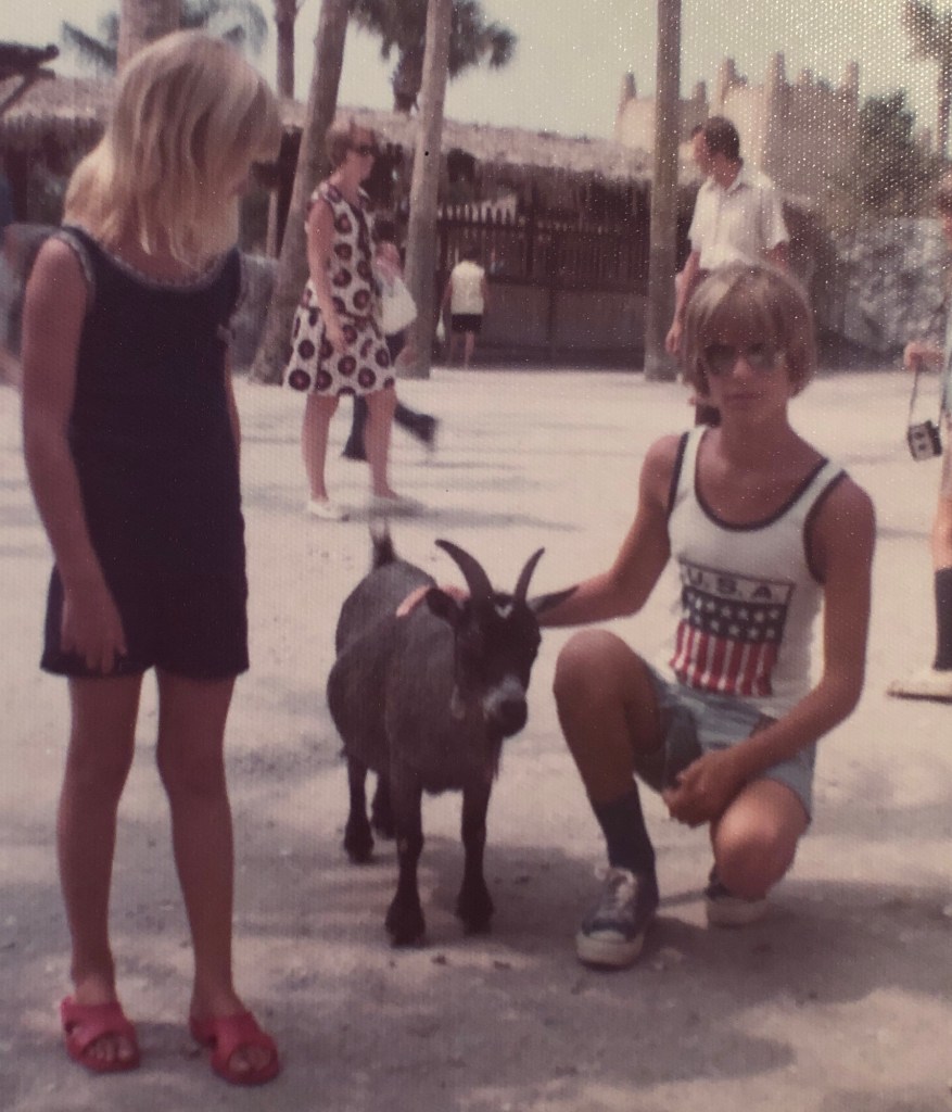 Next I unearthed my Mickey Mouse souvenir ears, complete with “Robin” stitched in gold across the back. The trip to Disney was never spoken of without mentioning that I showed up at the park the first day barefoot. How it wasn’t noticed when we got in the car at Daytona Beach or anywhere along the way, I don’t know. You’d think someone would have checked since I had previously shown up at the USS North Carolina Battleship in Wilmington barefoot the summer before. Dad had had to carry me on his back across the scorching August-hot deck of the ship. As we popped out of the car and began to lock it up to approach the ticket booths at Disney World, Mom looked down and asked, “WHERE ARE YOUR SHOES????” The answer? Right where I had taken them off when we got to the beach. For obvious reasons, I hated shoes and never wore them voluntarily (until I became shoe obsessed as a teenager). We all got back into the car, pulled out of the pay lot, and went to a souvenir store right outside the gate. The only shoes they sold were flip flops that were at least two or three sizes too big for me. That’s what I wore to the park that day. I don’t remember it slowing me down much. I remember most the “It’s a Small World” ride, because it was cool in every sense of the word. We escaped the August heat and were entertained by hundreds of animatronic dolls dressed in authentic costumes from all over the world. It felt like being inside a storybook.